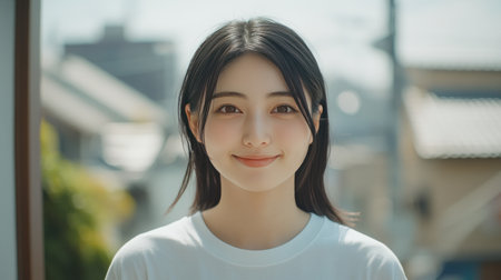 A very pretty Japanese woman, 20 years old, wearing a casual t-shirt, smiling warmly at the camera, simple and fresh appearance.