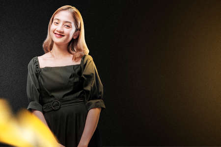 40 Year olds Asian working woman with long black and tied hair, smiling happily, looking camera in a yellow polka dot dress and makeup face. Headshot with natural light and copy space white background