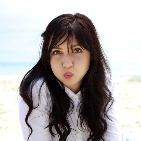 Young beautiful brunette girl lighten up at the beach in spring time. Outdoor photo.