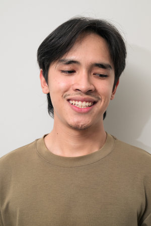 Portrait of self-confident middle age Asian man in a white t-shirt on grey background.