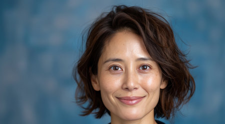 Studio shot of Cheerful portrait close up japaness woman while standing with a blue background.