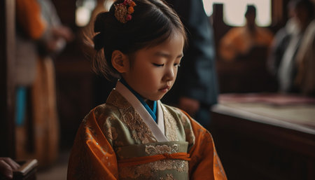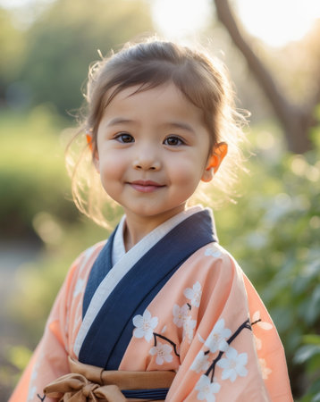 AI Generated. Adorable Young Girl in Peach and Navy Kimono Outdoors