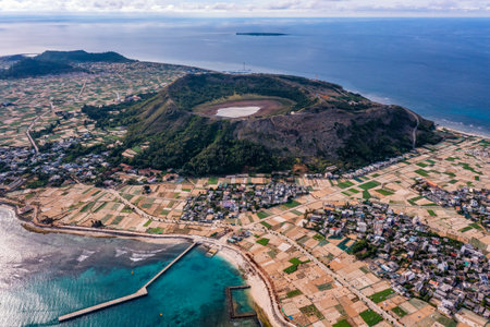 A breathtaking view of a volcanic island from above, illustrating the power and beauty of nature from the sky.
