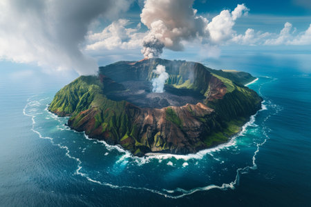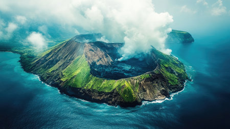 Volcanic island seen from above, with steam rising from the crater generative ai