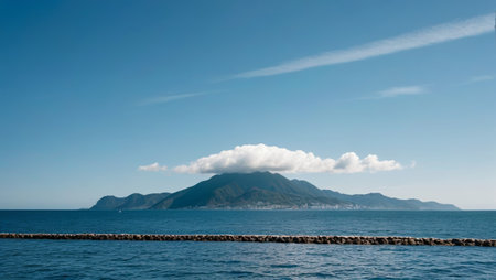 Distant mountains at sea and blue sky and white clouds