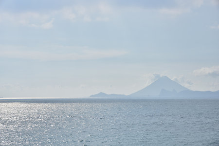 Active volcano and volcanic plume facing the sea called Sakurajima in Kagoshima, Japan