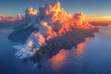 A breathtaking aerial view of a volcanic island surrounded by the ocean. the dramatic scene is highlighted by vibrant sunset hues, with towering clouds illuminated in shades of orange and pink. ideal for travel posters, digital wallpapers, and nature-themed designs. Generative AI