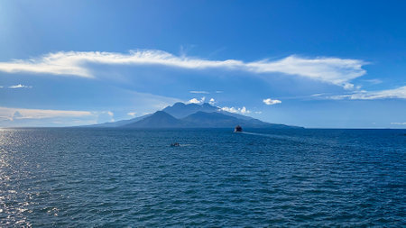 Sakurajima mountain, sea and blue sky background, Kagoshima, Kyushu, Japan