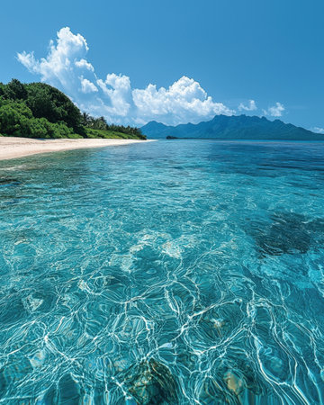 A serene coastal scene featuring shimmering azure waters, vibrant green foliage along the shore, and majestic mountains fading into a radiant blue sky