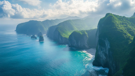 Stunning aerial view of a coastal landscape featuring lush green cliffs and azure waters, all under a dramatic cloudy sky, evoking a sense of tranquility and adventure.