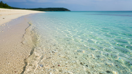 This image showcases crystal clear turquoise water washing onto a sandy beach. The composition captures the natural textures of the sand and water. The scene is bathed in sunlight, suggesting a bright day. The photograph could be used for various commercial or editorial purposes.