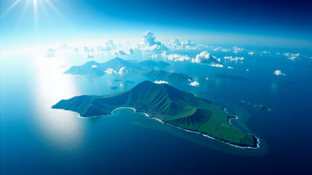 Bright sun reflects off calm blue waters surrounding lush green islands. Rolling hills stretch across the landscape, with puffy clouds dotting the sky above.