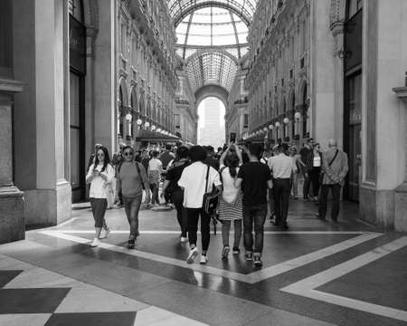 MILAN, ITALY - CIRCA APRIL 2018: People walking in the city centre in black and white