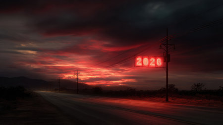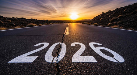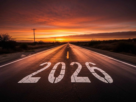 2026 New Year road trip travel and future vision concept . Nature landscape with highway road leading forward to happy new year celebration in the beginning of 2026 for glee and successful start .