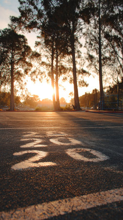 An asphalt road features painted numerals denoting the year 2020. The scene includes silhouetted trees against a vibrant sunset. The lighting creates a dramatic contrast with potential use in illustrative projects or concepts related to time, progression, and the environment. Suitable for editorial and commercial use.