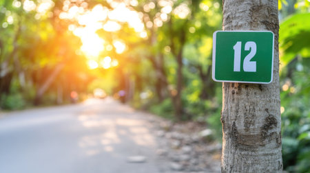 A close-up view of a vibrant green sign displaying the number 12, securely fastened to the rough bark of a tree trunk.