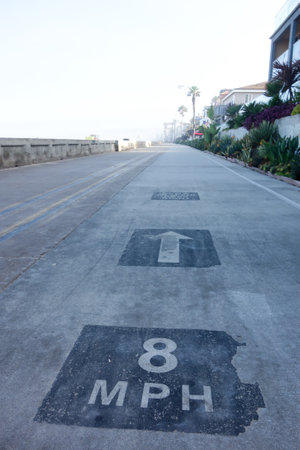 Foggy early morning at Mission beach ocean front walk restricted to slow moving bikes, runners and pedestrians, San Diego, Southern California