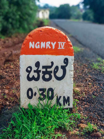 Chikhale, KA / India - June 03 2020: Milestone on a rural road showing 0.30 km to Chikhale village near Belgaum Karnataka, on the way to Chikhale waterfalls on a monsoon trip.