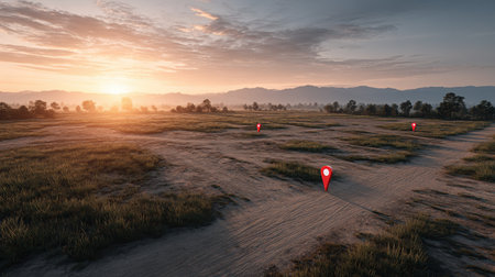 Serene Landscape at Sunset with Location Pins Marking Trails in Grasslands and Mountains in the Background for Adventure and Exploration Themes