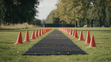 A timing mat and finish line tape fluttering in the breeze, with cones lining the way