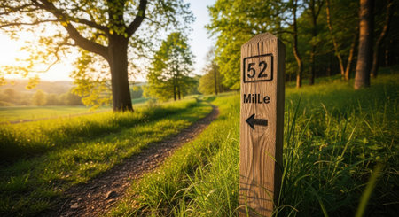 A peaceful rural pathway winds through a lush green forest with sunlight filtering through the trees, creating a warm and serene atmosphere perfect for nature and outdoor activity marketing.