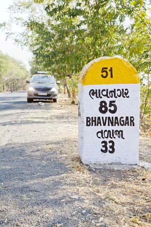 Rural landscape in Gujarat India incorporating 85 kilometers to Bhavnagar milestone and land mark on the coastal road to Dwarka a religious town for Hindus Parked people carrier with head lights switched on