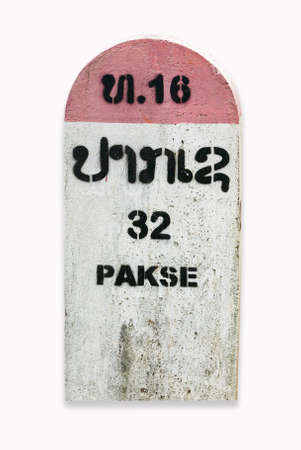 Milestone on the national highway T 16 near Champasak, South Laos, indicating 32 kilometers to Pakse from Salavan, near Vietnam border. Isolated on white background