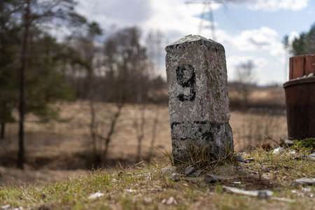 Branch post in the forest. Marking in forest area. A stone post painted white with black numbers. Forest in the winter.