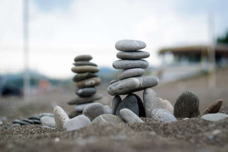 The pyramid of pebbles on the beach, selective focus.