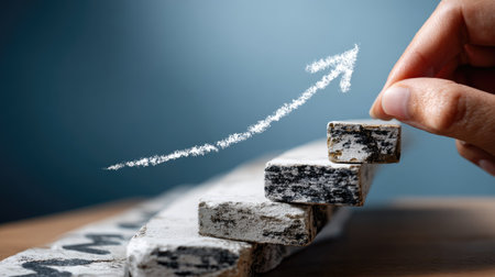 A close-up image of a hand carefully placing wooden blocks to create an upward growth arrow, symbolizing progress and success in various aspects of life.