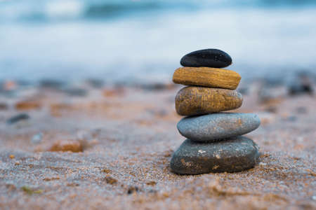 Zen concept. Object made of stone on the beach. Stone pyramid for meditation. Harmony and Meditation. Zen stones.