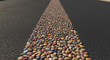 Asphalt road with colored pebbles, closeup of photo