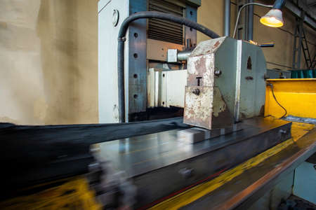 Part of lathe in workshop is close-up. Old lathe for metal processing stands in factory premises. Industrial background.
