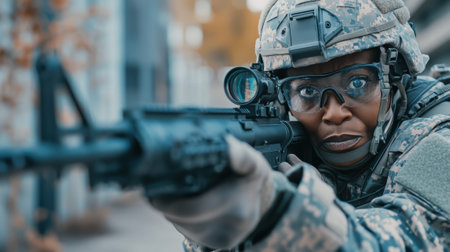A determined female soldier in combat gear aims her rifle with precision, displaying focus and readiness in a tactical mission.