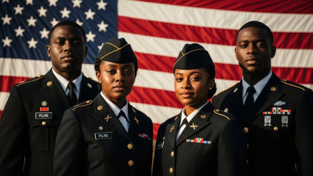 Young Black soldiers in uniform, American flag background