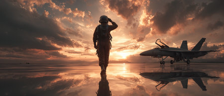 Pilot in flight suit standing near a fighter jet at sunset, symbolizing aviation, courage, and military precision.