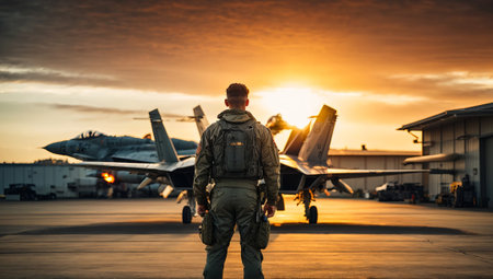 The photo is of high quality. A man walks down the runway of a military airbase toward a fighter jet. Military prepares for combat flight. Army and air armed forces. Sunset. Illustration of varied design.
