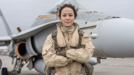 A confident female pilot stands proudly beside a fighter jet, embodying strength and determination within the aviation industry. She showcases her skills and commitment.