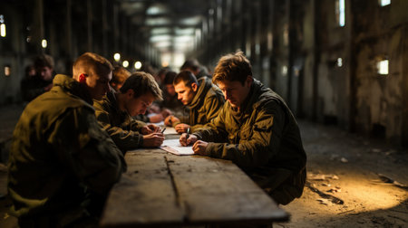 Group of prisoners soldiers sit at table in an abandoned Penitentiary.