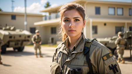 Portrait of beautiful female soldier standing in front of military armored vehicles