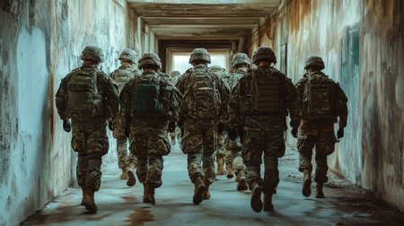 A group of soldiers in camouflage uniforms moves in formation down a dimly lit, deserted corridor. The atmosphere suggests a training exercise or mission readiness