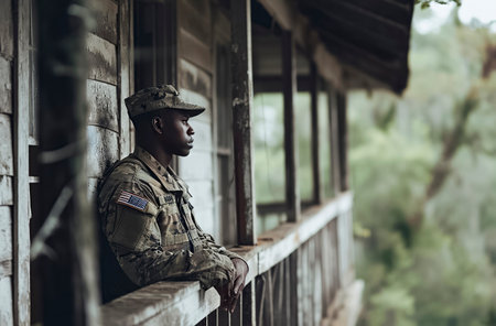 in military attire sits contemplatively on a wooden porch, surrounded by lush greenery, ai generative