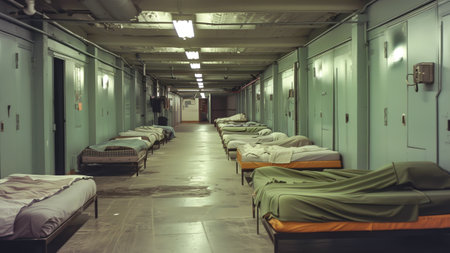 Sleeping quarters for homeless people in temporary shelter. Long hall with beds by walls lit by led lamps. Interior of empty flophouse