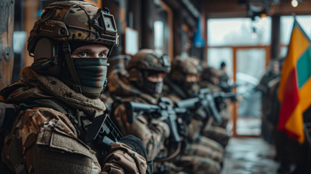 Soldiers in Military Gear Prepare for Action While Guarding an Entrance, Showcasing Teamwork and Focus in an Urban Setting. Generative AI