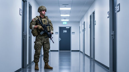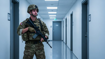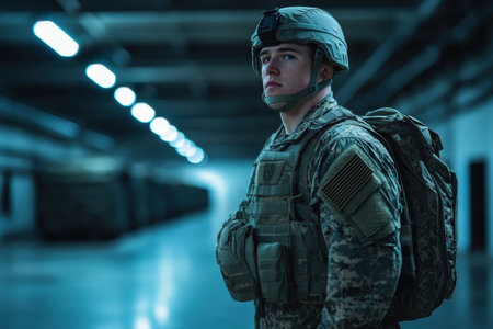 A soldier in tactical gear stands in a dimly lit military facility, focused on the surroundings.
