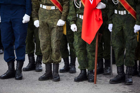 View at the black lowquarters and military uniform of unrecognizable Russian soldiers standing in line, Russia