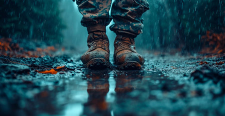 Close up of marines boots treading through mud with camouflage pants in blurred background