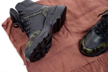 Pair of black army boots on fabric with blue camouflage with copy space for text. No people