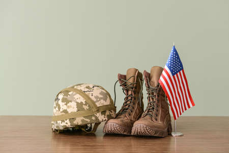 Military boots, chalkboard and USA flag on wooden background. Memorial day celebration