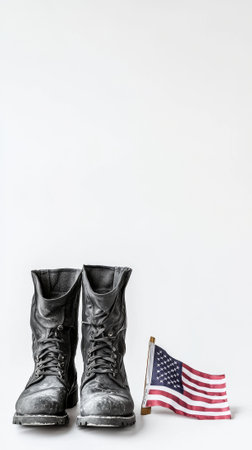 Black Military Boots and American Flag on White Background. Concept of Patriotism, Veterans Honor, Armed Forces, National Pride. American Memorial Day Vertical. Copy space.